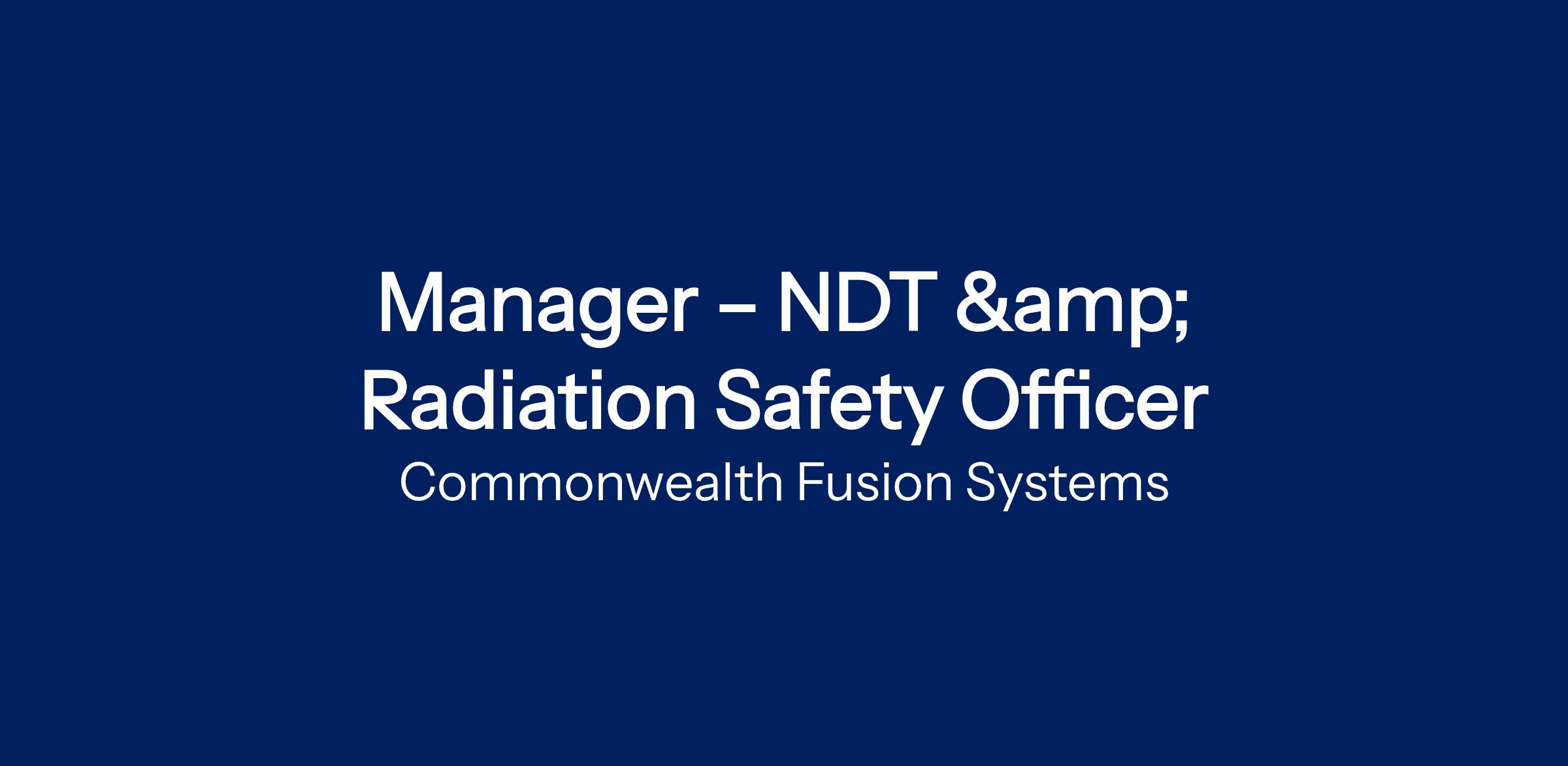 The Manager of NDT and Industrial RSO is the technical owner of NDT Operations and industrial radiography radiation safety at CFS. This role is responsible for developing and maintaining the organization's NDT capabilities to ensure successful delivery of SPARC and to prepare for the future scaling for ARC power plants.