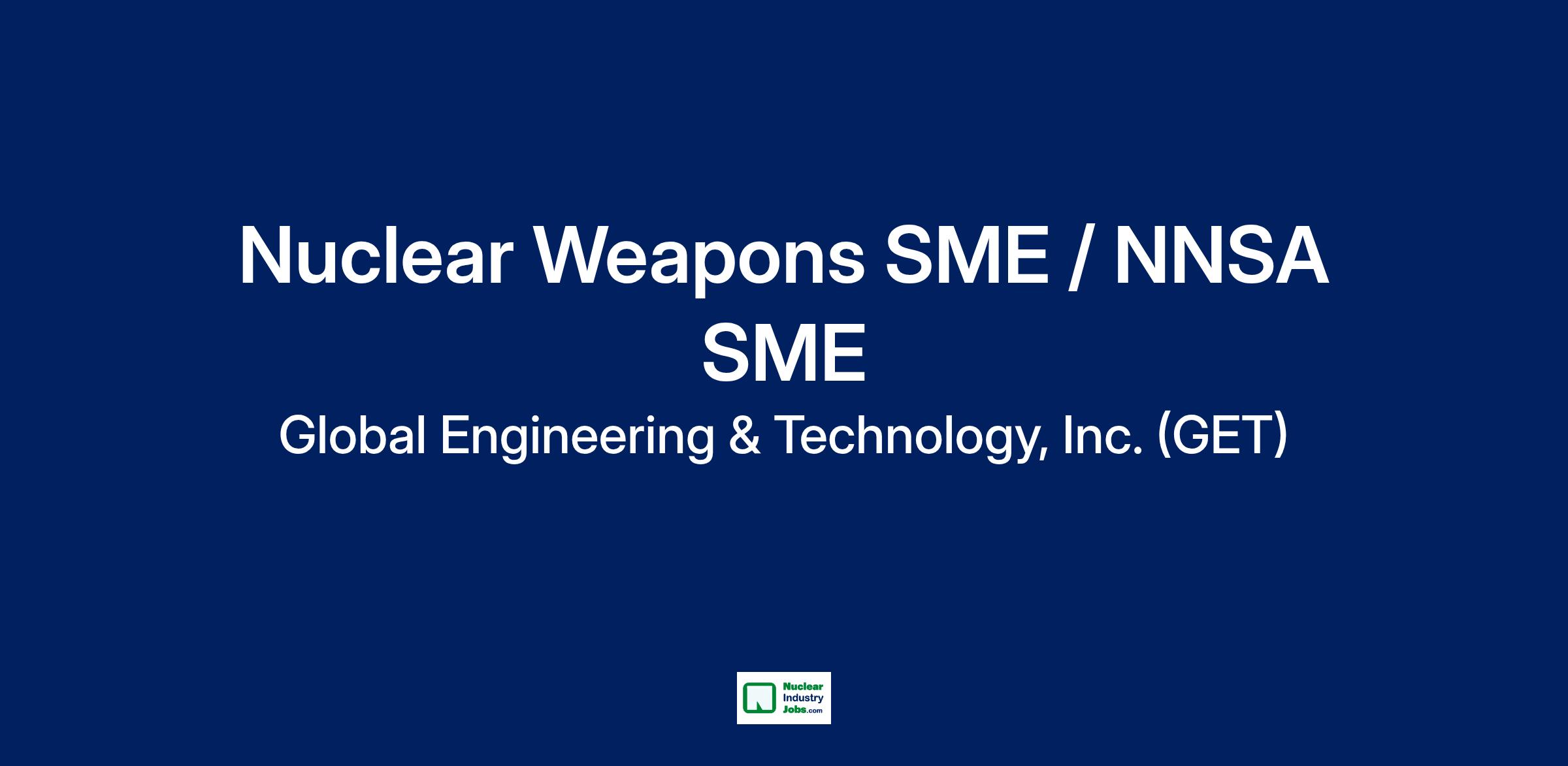 Global Engineering & Technology (GET) is seeking qualified individuals for the position of Nuclear Weapons Subject Matter Expert (SME) in support of the Department of Energy's Office of Classification in Germantown, Maryland.